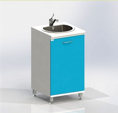 Тумба с дверцей, с вырезом в задней стенке для подвода коммуникаций, оснащена мойкой из нержавеющей стали, локтевым смесителем, сифоном.